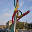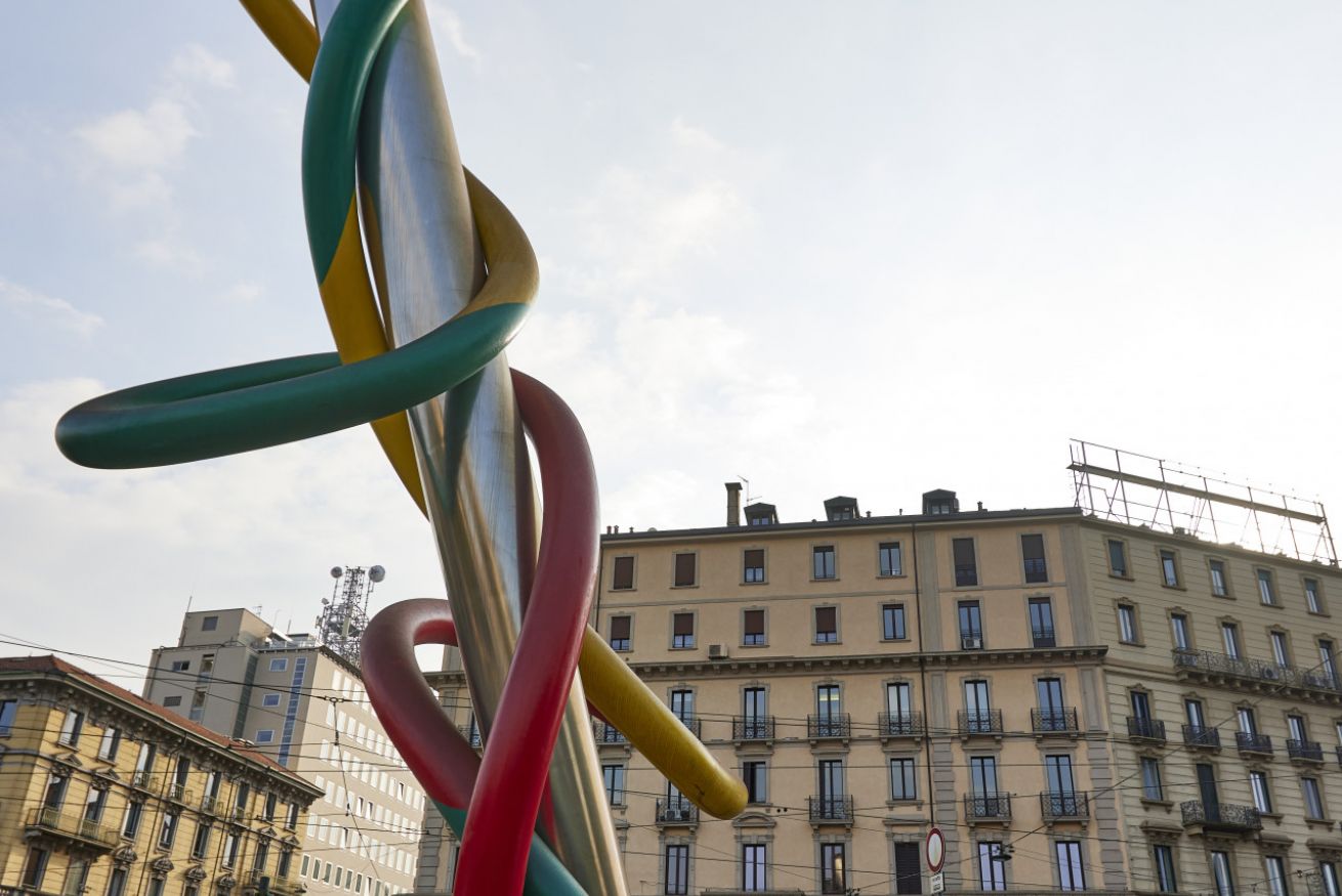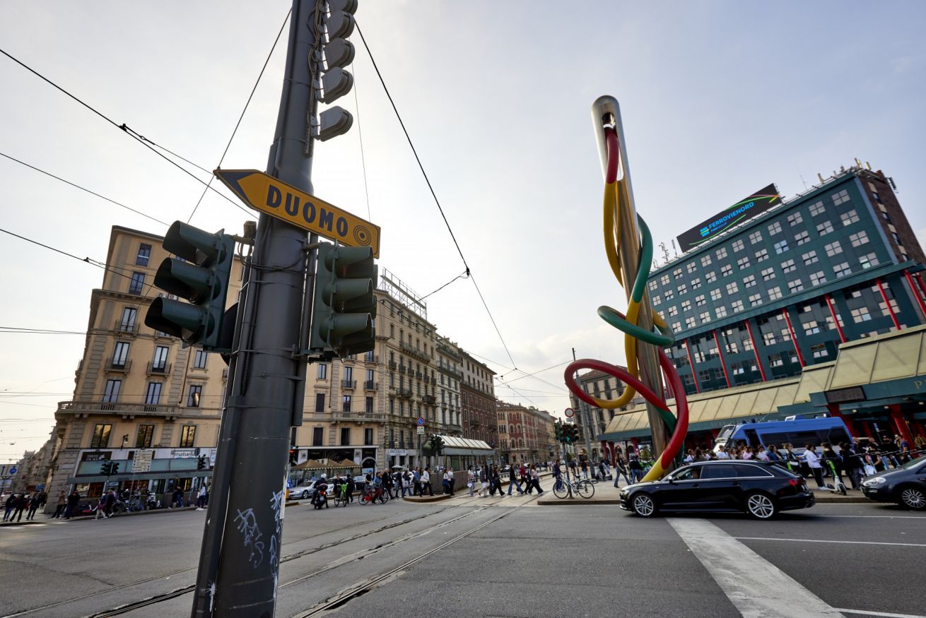 L’elemento centrale è la celebre installazione “Ago, Filo e Nodo”, opera in acciaio e vetroresina alta 18 metri, realizzata da Claes Oldenburg e Coosje van Bruggen nel 2000. Questa scultura iconica simboleggia il dinamismo e la creatività milanese, con colori che richiamano le tre linee della metropolitana.
