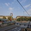 Camminando tra le pensiline trasparenti, le colonne rosse e le fontane che animano la piazza, si percepisce l’incontro tra la vita metropolitana e l’essenza culturale della città.