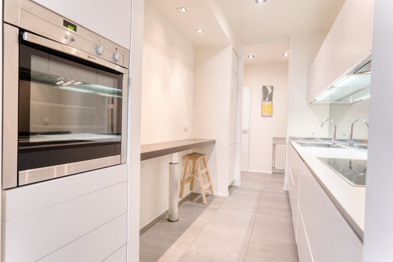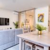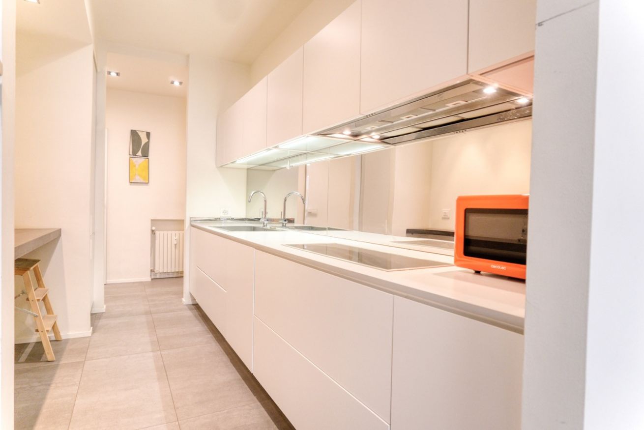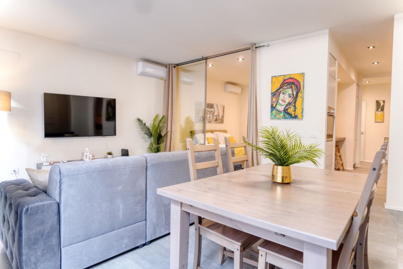 La zona giorno è spaziosa e ben organizzata, con un comodo divano, TV a schermo piatto e una zona pranzo luminosa affacciata sulle finestre. La cucina a vista, completamente attrezzata, è dotata di elettrodomestici moderni, forno, piano cottura a induzione, macchina da caffè e tutto il necessario per soggiorni anche di media durata.