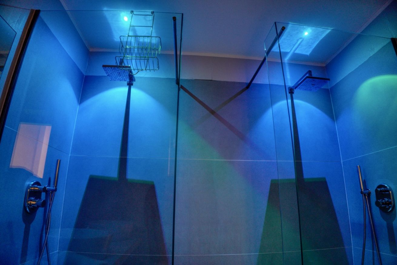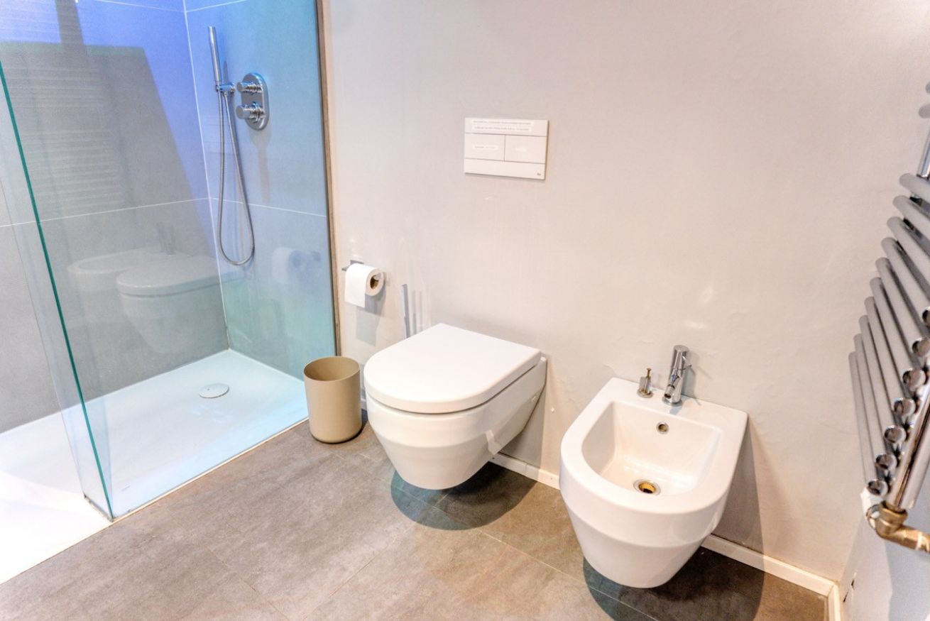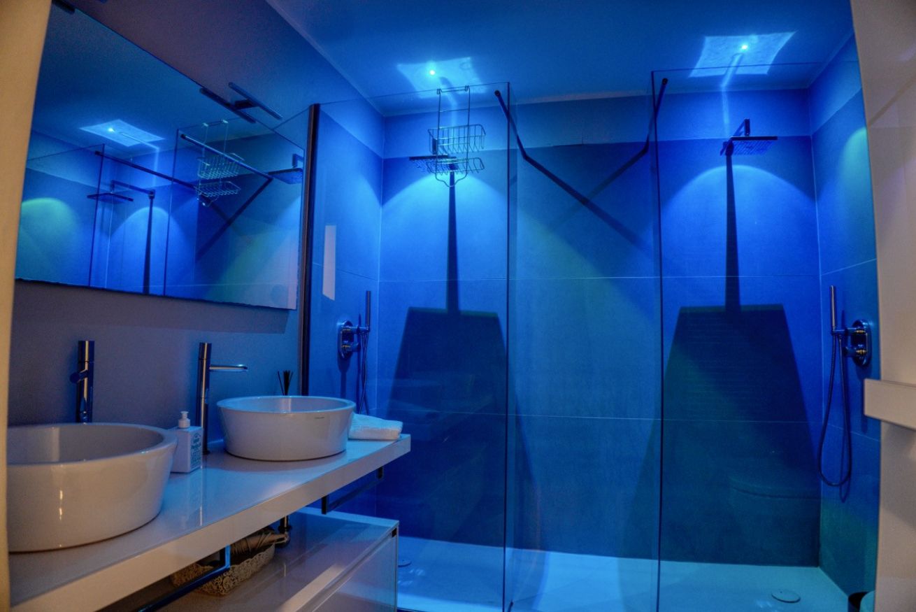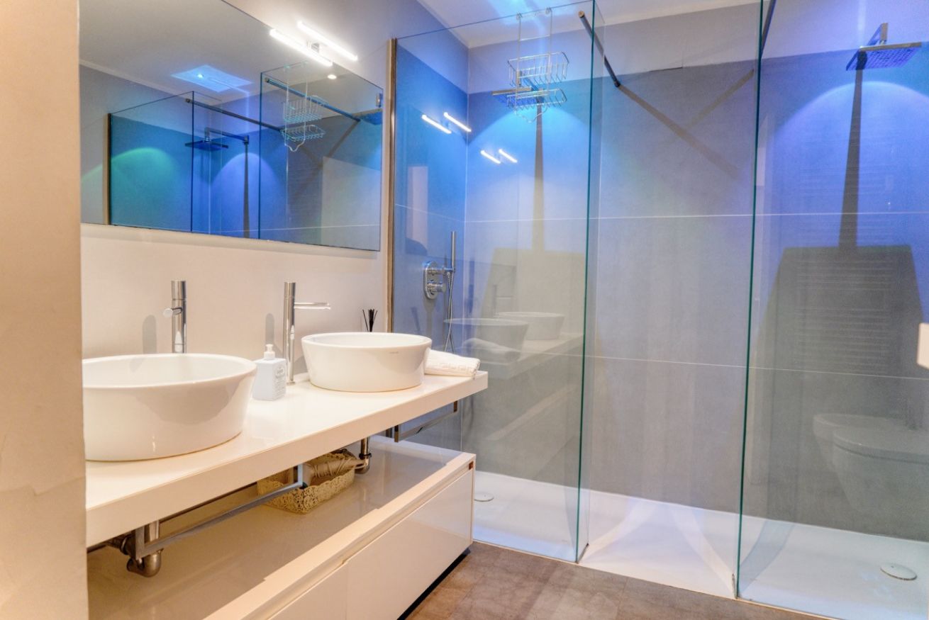 Il bagno è uno dei punti di forza dell’appartamento: ampio, moderno e dotato di una grande doccia walk-in con doppio soffione e illuminazione scenografica, doppio lavabo e finiture di design che trasformano il momento della doccia in una vera esperienza di relax.