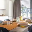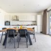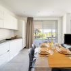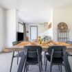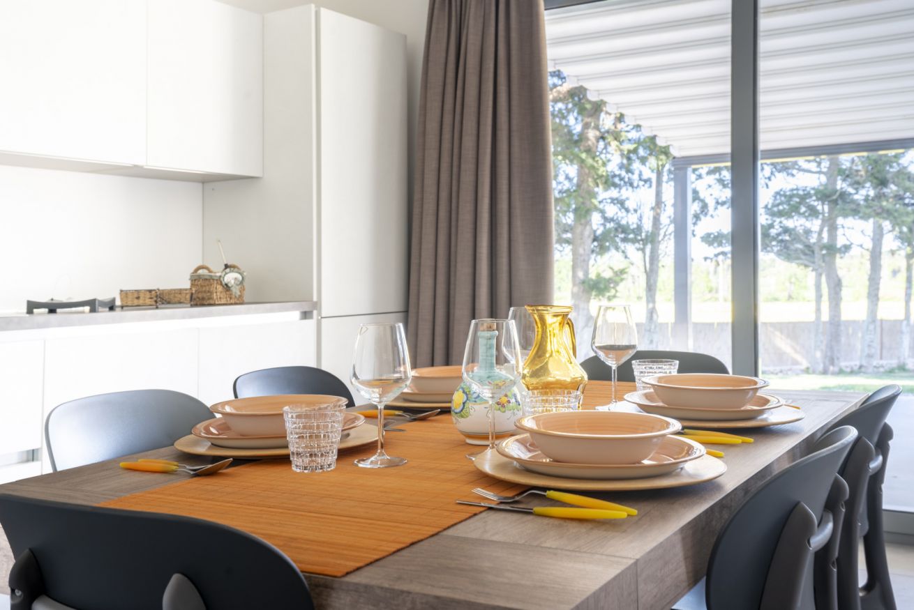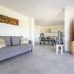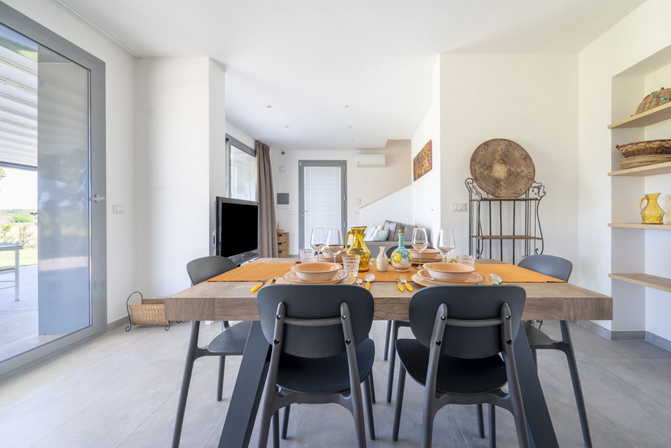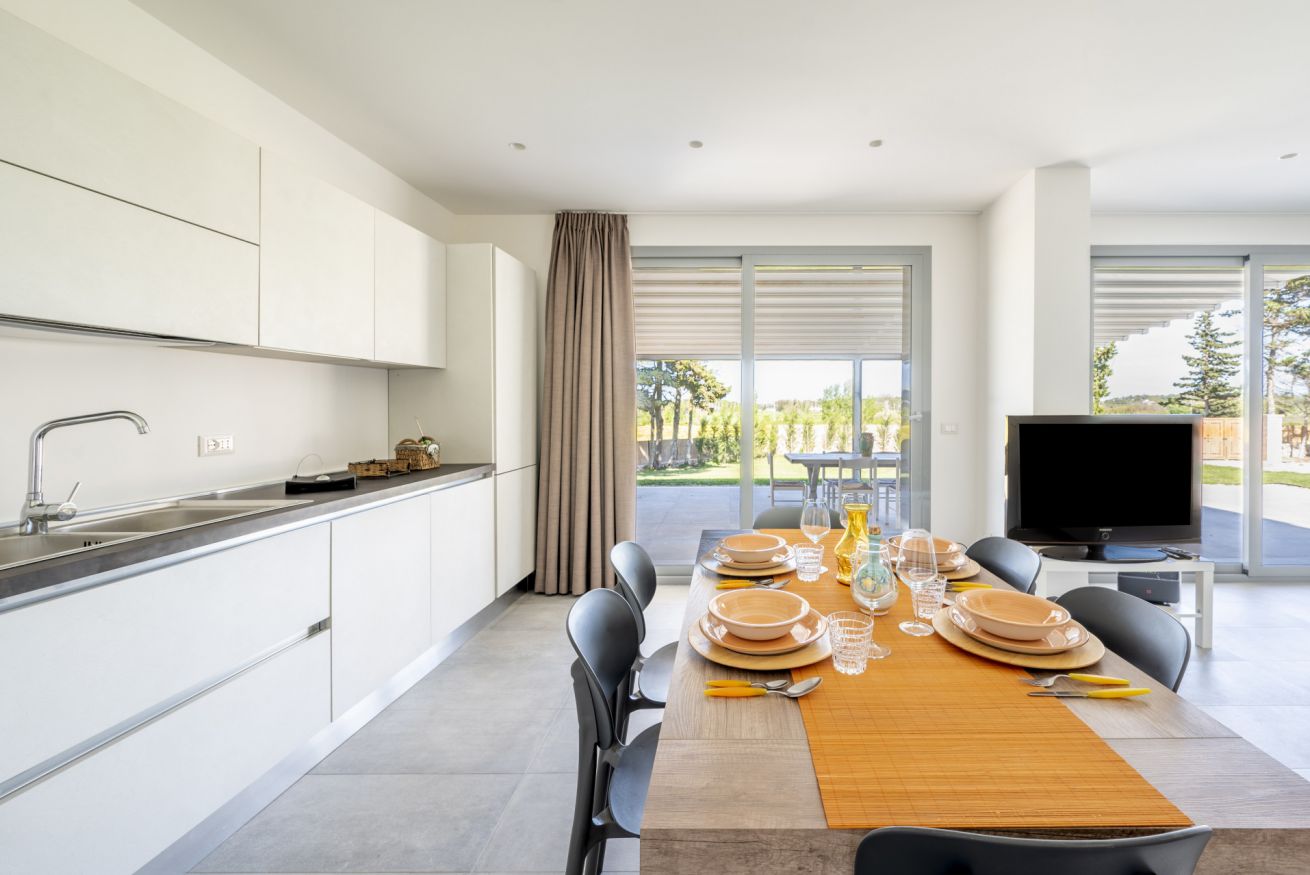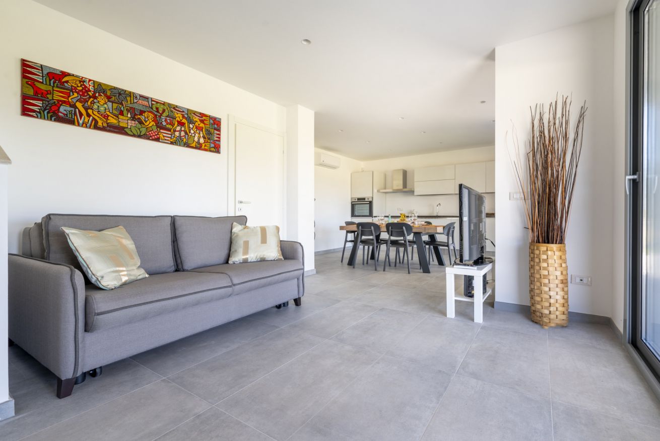 L’ingresso si apre su un ampio open space che unisce il soggiorno, la zona pranzo e la cucina. Il salotto, arredato con gusto minimalista e tocchi etnici, offre un comodo divano e una TV a schermo piatto, ideale per momenti di relax. Il tavolo da pranzo in legno massello, con stoviglie eleganti e oggetti decorativi artigianali, è pensato per convivialità e piacere estetico. La cucina, lineare e attrezzata con elettrodomestici moderni, si affaccia sulle ampie vetrate che conducono alla veranda esterna.