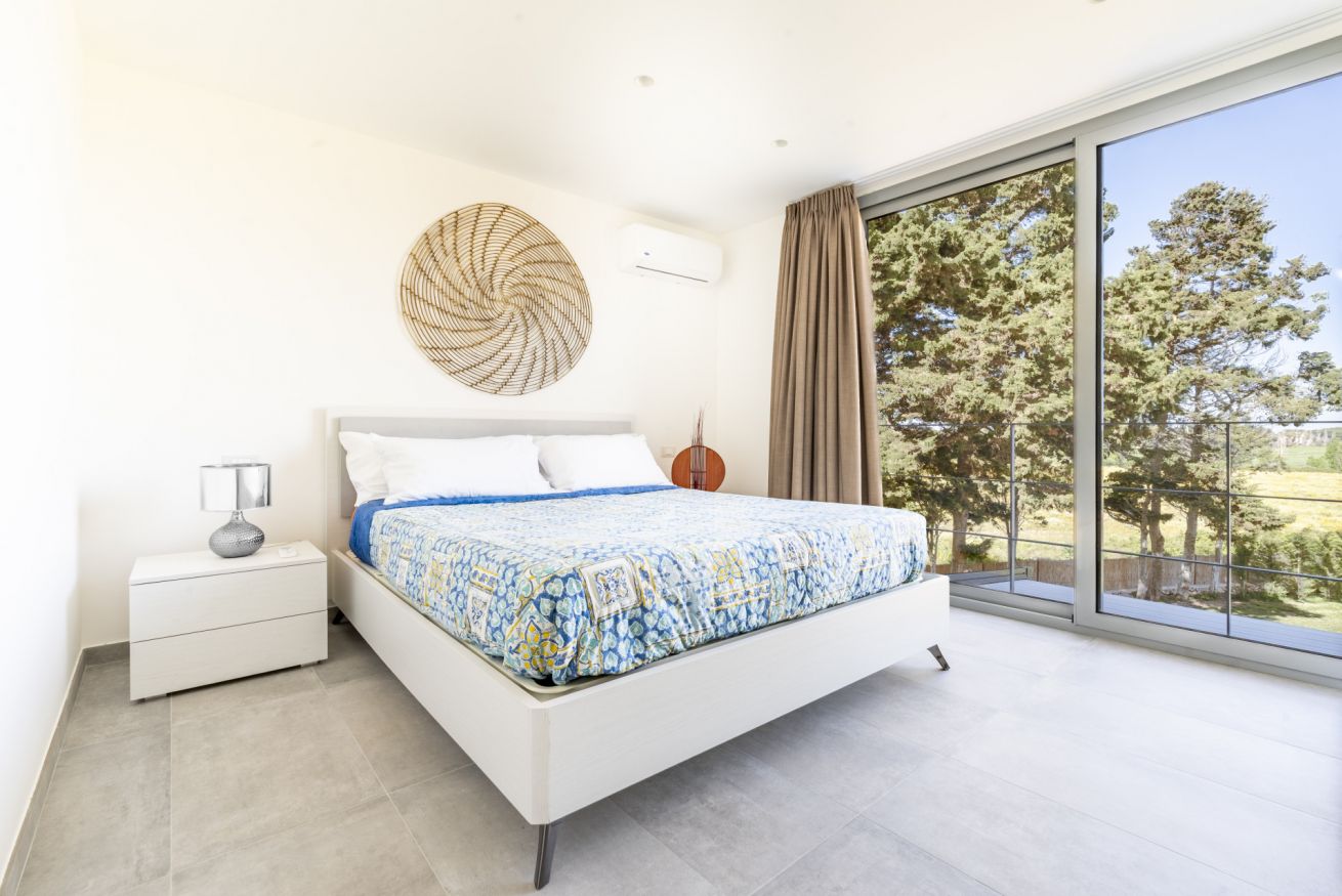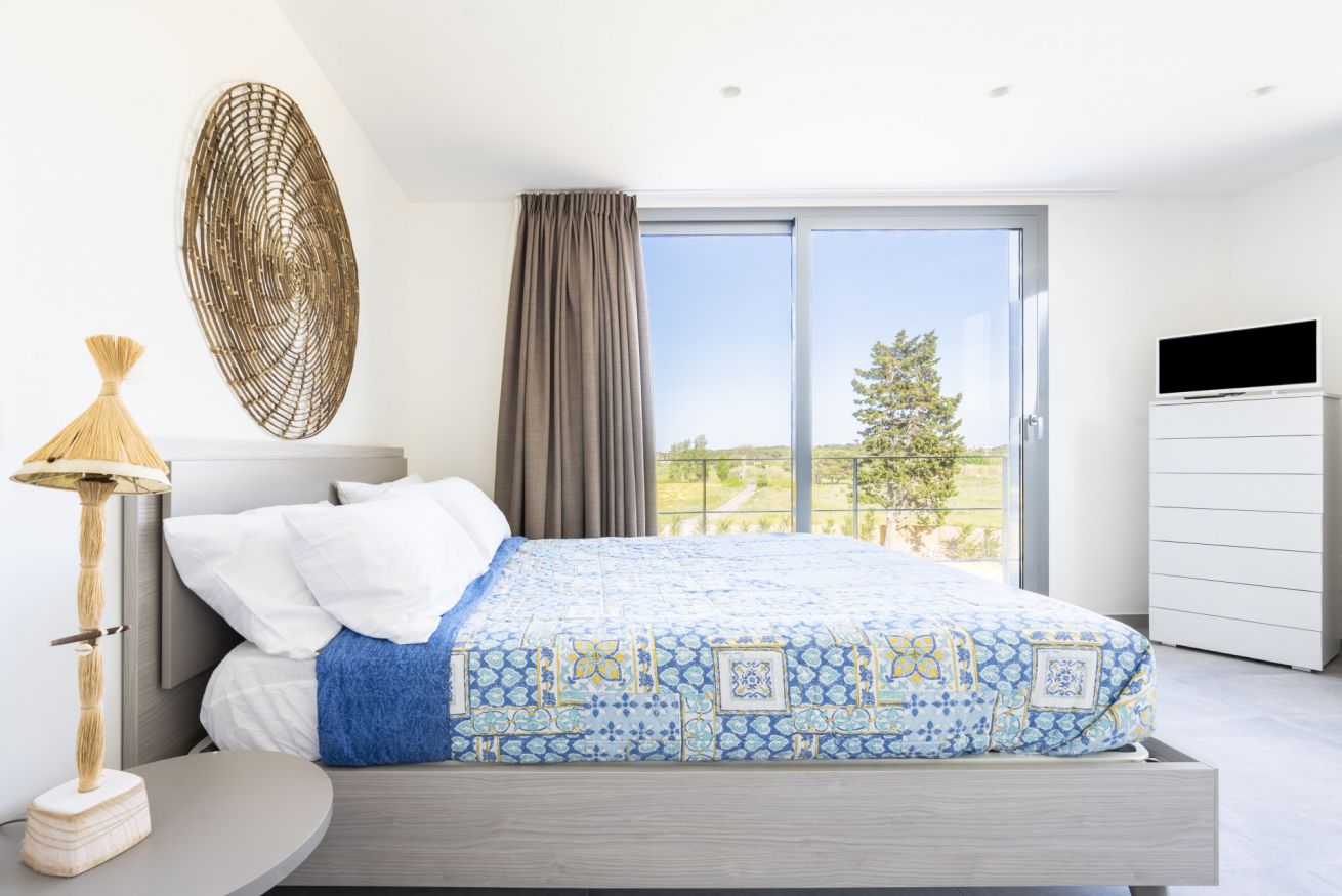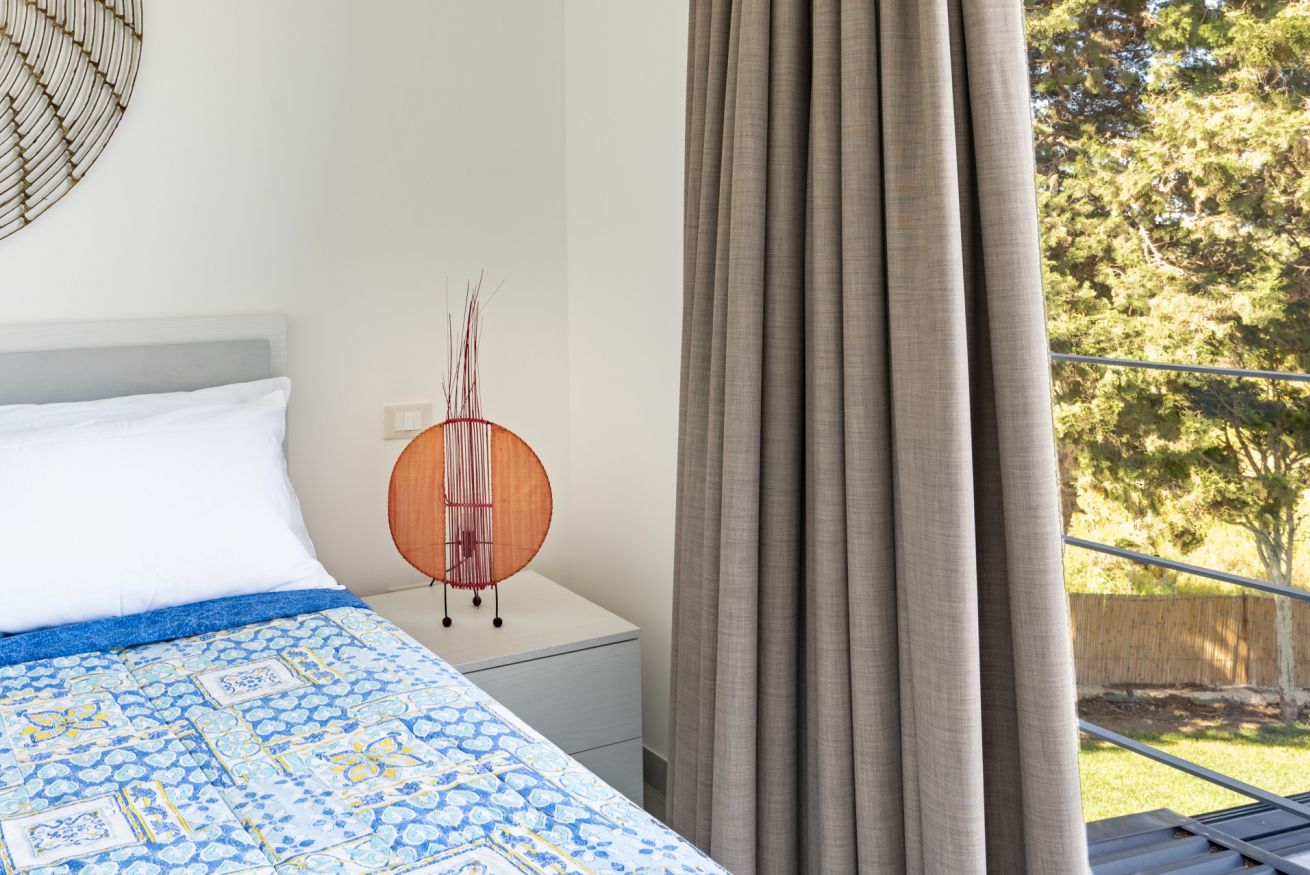 Al piano superiore, le camere da letto sono ampie e luminose, dotate di grandi vetrate con vista sulla campagna. L’arredamento è essenziale ma accogliente, con letti matrimoniali, cassettiere moderne e armadi spaziosi. I dettagli etnici e i materiali naturali, come il grande disco in vimini sopra al letto, aggiungono carattere e calore agli ambienti.