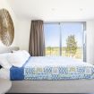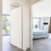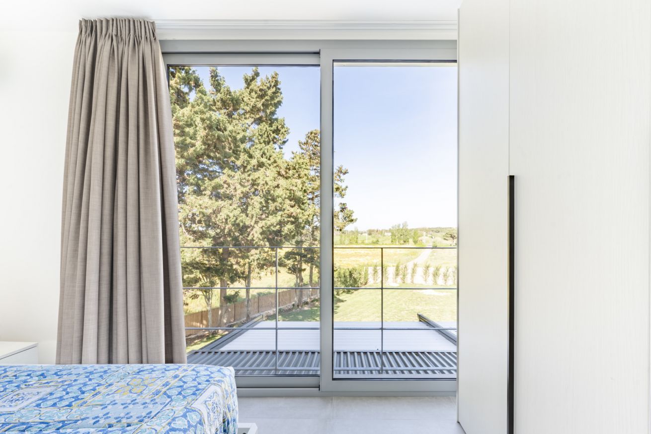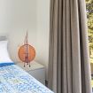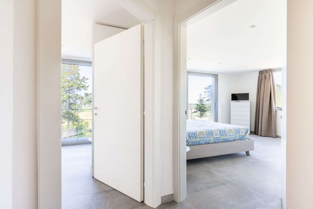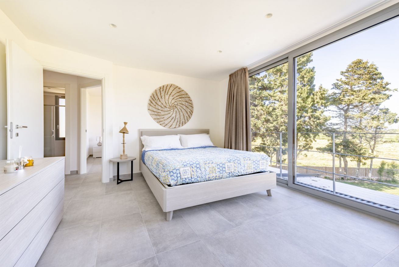 Al piano superiore, le camere da letto sono ampie e luminose, dotate di grandi vetrate con vista sulla campagna. L’arredamento è essenziale ma accogliente, con letti matrimoniali, cassettiere moderne e armadi spaziosi. I dettagli etnici e i materiali naturali, come il grande disco in vimini sopra al letto, aggiungono carattere e calore agli ambienti.